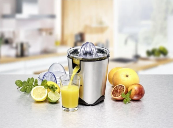 Frisch gepresst schmecken Säfte am besten. Mit der eleganten Zitruspresse aus hochwertigem Edelstahl pressen Sie im Handumdrehen den letzten Tropfen aus Orangen, Zitronen und Grapefruits, dank der zwei unterschiedlichen Presskegel. Es genügt leichter Druck, den Rest übernimmt der leistungsstarke Motor. Ideal für den Vitaminkick zwischendurch. Der Saft fließt über eine klappbare Auslauftülle direkt in ein Glas, der Nachtropfstopp sorgt dafür, dass kein Tropfen verloren geht. Das Edelstahlsieb ist abnehmbar und kann zusammen mit Presskegeln, Saftauffangbehälter und Staubschutzdeckel in der Spülmaschine gereinigt werden. Frisch gepresster Saft sollte auf keinem Frühstückstisch fehlen.