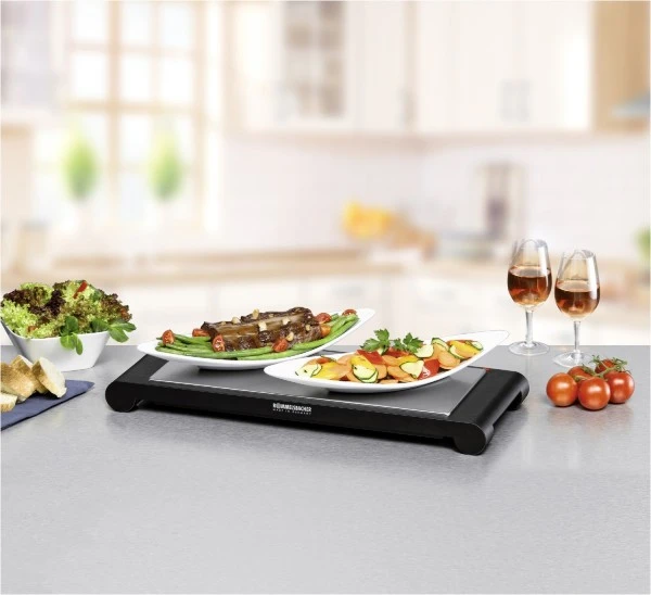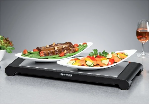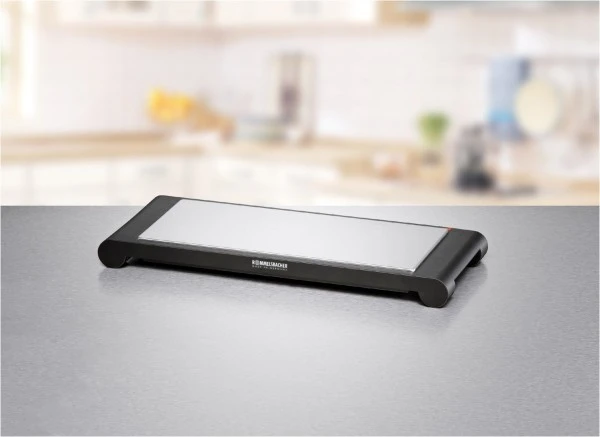 Die Heizfläche aus gebürstetem Edelstahl ist langlebig und pflegeleicht. Mit eingestecktem Kabel wird die Speicherplatte in nur 8 Minuten auf Maximaltemperatur aufgeheizt. Danach kann das Kabel abgenommen und das Gerät auf dem Tisch oder Buffet platziert werden. Die Speicherplatte hält Speisen bis zu 60 Minuten warm, ohne dass sie erneut ans Stromnetz angeschlossen werden muss.