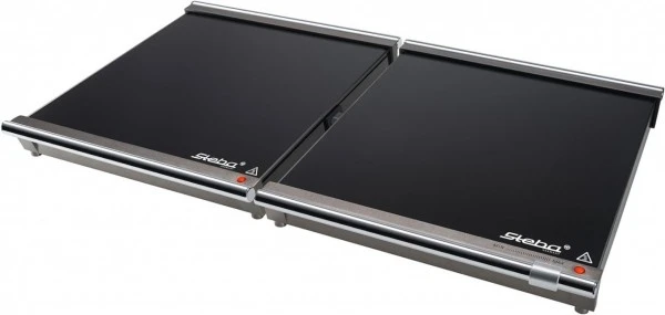 Doppel-Modul (Anfangs- und Endstück), Auch als Einzelplatte einsetzbar, Erweiterbar bis zu 5 Module (145 cm Gesamtlänge) für Buffets, Stufenlose Temperaturregelung (50-120°C), Betriebskontrollleuchte, Stabile Glasoberfläche, Chromgriffleiste, Superflache Bauweise, Platzsparende Aufbewahrung, 2x 135 Watt.