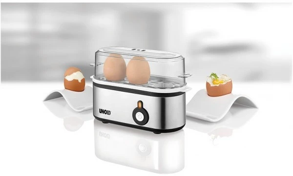 UNOLD® hat die Lösung für alle, die auf platzsparende Küchengeräte wert legen: Der EIERKOCHER Mini für ein bis drei Eier passt auch in die kleinste Küche. Messbecher mit Skala und Eierpiekser sind im Zubehör enthalten. Der EIERKOCHER Mini hat ein hochwertiges Edelstahlgehäuse. Dank des Eiereinsatzes mit Griff lassen sich die gekochten Eier sicher entnehmen. Bei Erreichen des gewünschten Härtegrades ertönt ein Signal. Alle nicht elektrischen Teile sind spülmaschinengeeignet.